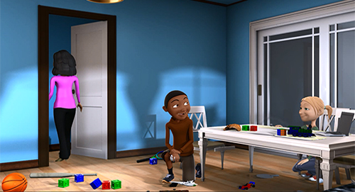 Webisode Summary: In this lesson, the learner must help the characters decide when and how to interrupt. In the first scene, Emma must choose a polite way to interrupt her teacher to ask for help. In the second scene, Sam has to interrupt his mom while she is on the phone. The learner must identify situations that could wait and choose a situation that would require him to interrupt.