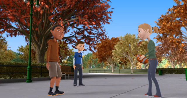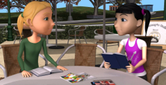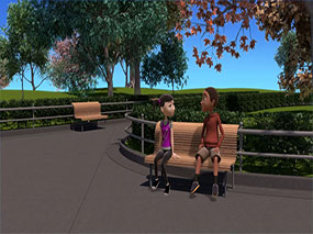 Webisode Summary: The lesson presents a situation where a character is attempting to have a three-way conversation. The user is given opportunities to help a character select which friend to be making eye contact with during the conversation.