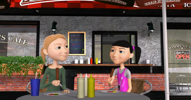 Webisode Summary: Emma and Katie are sitting at a table talking to each other and eating corndogs. Their conversation has been established and the user is taught options (i.e. ask a question, give a compliment or make a comment) to maintain the conversation successfully.